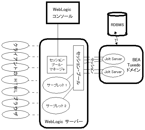 図 1-1 は、BEA Jolt for BEA WebLogic Server のアーキテクチャを示します。