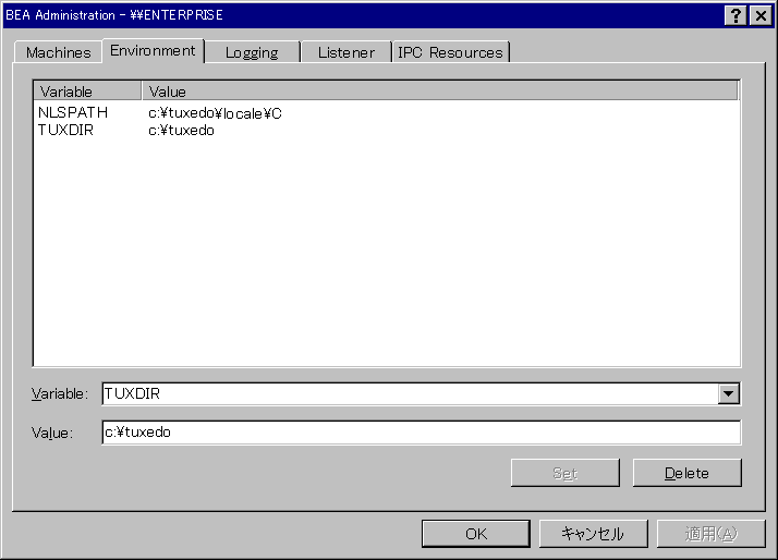 [Variable] フィールドには、最も頻繁に使用される BEA Tuxedo の環境変数が一覧表示されています。 環境変数を変更するには