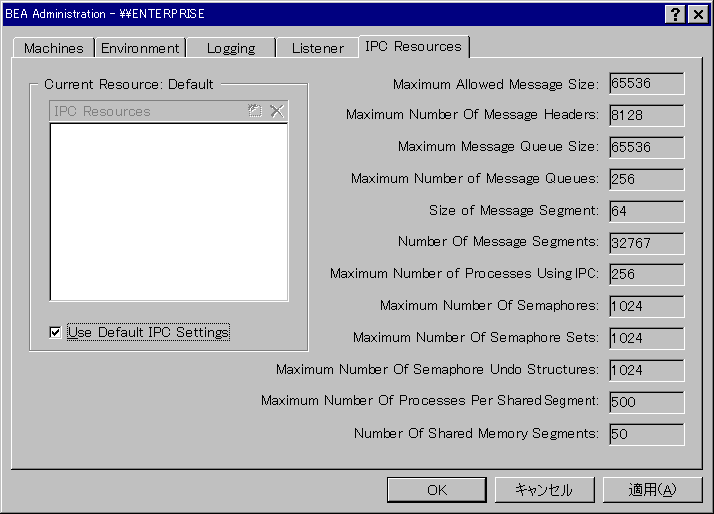 [IPC Resources] ページでは、さまざまな IPC 資源を設定することができます。BEA Tuxedo マシンの IPC 資源を設定するには、次の操作を行います。