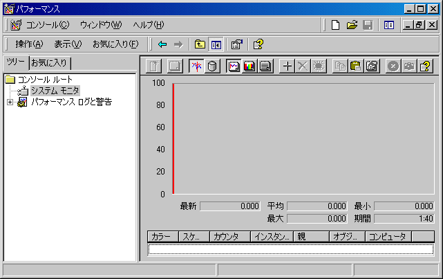 パフォーマンス・モニタを起動するには、Windows 2000 のタスクバーで [スタート] メニューの [設定] をポイントして [コントロール パネル] をクリックします。次に [管理ツール] から [パフォーマンス] をクリックします。パフォーマンス・モニタの画面が表示されます (図 2-10 参照)。