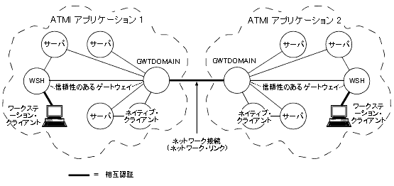 次の図は、BEA Tuxedo リリース 7.1 以上のソフトウェアで使用される、高信頼性委託型認証モデルをしています。高信頼性委託型認証モデルでは、ワークステーション・ハンドラ (WSH) およびドメイン・ゲートウェイ (GWTDOMAIN) は、「信頼性のあるシステム・ゲートウェイ・プロセス」と呼ばれます。これについては、「委任された信用認証について」を参照してください。
