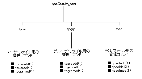 ユーザ、グループ、および ACL のファイルは、application_root ディレクトリに置かれています。application _root は、APPDIR 変数に定義された最初のパス名です。次の図は、これらのファイルと、各リストを制御するための管理コマンドを示しています。