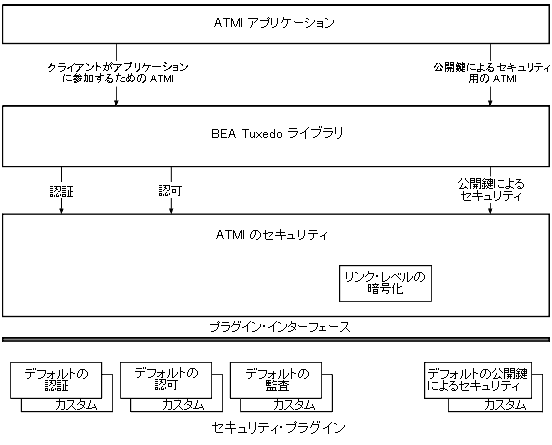 次の図に示すように、アプリケーション・プログラマは、ATMI 関数を使用して、ユーザを認証したり、ユーザによるアクセスを制御したり、公開鍵による暗号化の技術をアプリケーションに組み込むことができます。ただし、図が示すとおり、監査およびリンク・レベルの暗号化を行うための ATMI 関数は、アプリケーション・レベルでは用意されていません。監査は、BEA Tuxedo のシステム・レベルで実行されます。また、リンク・レベルの暗号化は、アプリケーション管理者側で設定します。