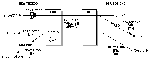 次の図は、BEA Tuxedo システムと BEA TOP END システム間のセキュリティを示しています。詳細については、以下の節を参照してください。