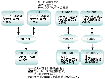 次の図は、STOCKAPP の構成を示しています4 つのサービス要求のいずれかを選択します。楕円は、アプリケーション・サービスを表しています。