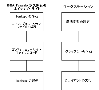 次の図は、ワークステーション・クライアントで bankapp を実行する手順を示しています。