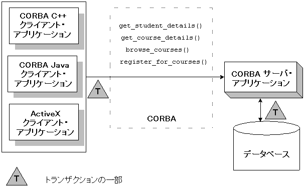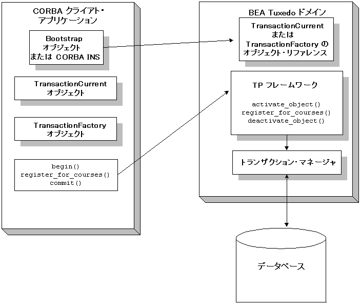 図 5-1 は、BEA Tuxedo CORBA アプリケーションでトランザクションがどのように機能するのかを示しています。