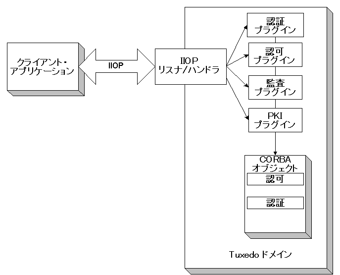 図 1-3 に示したように、BEA Tuxedo 製品で利用可能な認証、認可、監査、および公開鍵によるセキュリティ機能は、プラグイン・インターフェイスを通じて実装されます。このインターフェイスを使用することで、セキュリティ・プラグインを CORBA 環境に統合できるようになります。セキュリティ・プラグインは、特定のセキュリティ機能を実装するコード・モジュールです。