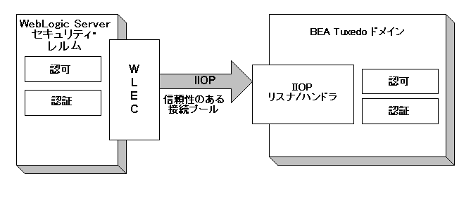 WebLogic Server のセキュリティ・レルムと BEA Tuxedo のドメインは、別々のスコープを持つセキュリティ定義と見なされます。それぞれは、ユーザおよびアクセス制御に関する独自のセキュリティ・データベースを持っています。ただし、WebLogic Enterprise Connectivity (WLEC) を使用すると、信頼性のある接続プールを構成する接続を介して、WebLogic Server セキュリティ・レルムで認証されたプリンシパルの ID を提示し、BEA Tuxedo ドメインで認証されたプリンシパルの ID を作成することができます。