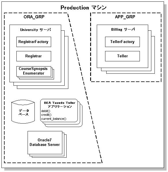 注記 Production サンプル・アプリケーションの使用を簡単にするには、1 つのデータベースを使い、1 つのマシン上で実行されるように、アプリケーションを BEA Tuxedo ソフトウェア・キット上でコンフィギュレーションします。ただし、この章で示した例では、アプリケーションは 2 つのデータベースを使って 2 つのマシン上で動作しています。