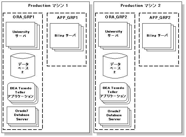 図 2-2 では、Production マシン 1 および 2 のグループの内容の違いはデータベースのみです。