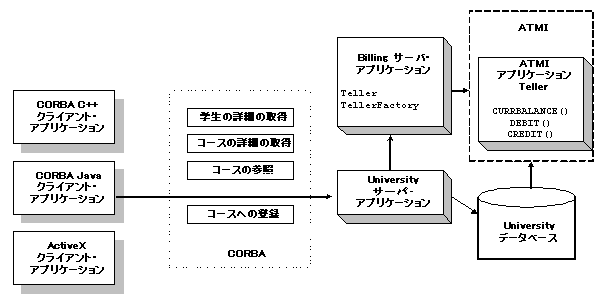 オブジェクトが ATMI サービスとの相互運用を行います。開発プロセスでは、Object Management Group (OMG) インターフェイス定義言語 (IDL) で Teller