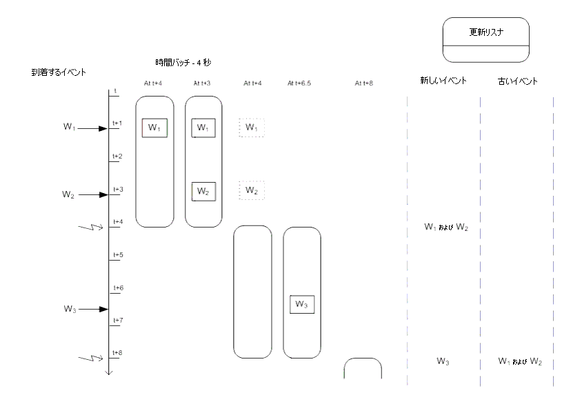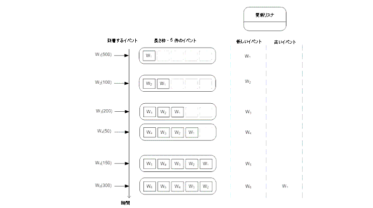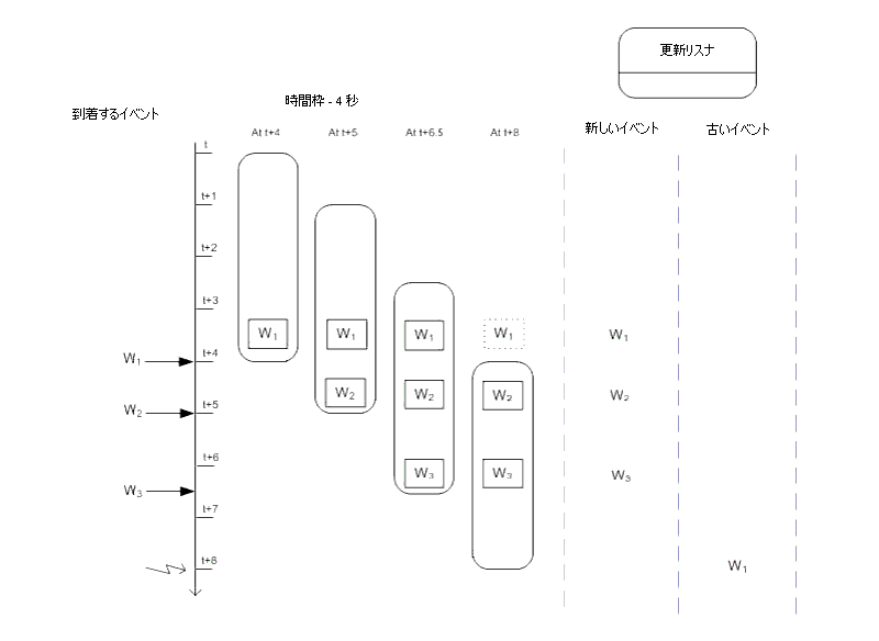 着信イベントは、スライド枠またはバッチ枠で処理されます。スライド枠では、1 件の増分データに対して徐々に枠が変化してイベントが処理されます。これに対し、バッチ枠では別個のデータ チャンクに対して枠が変化してイベントが処理されます。枠のサイズは、保持されるイベントの最大数またはイベントが保持される最大時間によって定義されます。