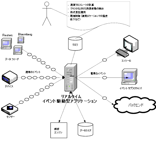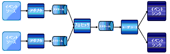 Oracle CEP アプリケーションは、通常、4 種類の主要なコンポーネントで構成されます。着信イベント ソースに直接インタフェース接続されるアダプタ、着信プロトコルを解釈してイベント データをプロセッサ (イベント処理エージェントなどのプロセッサ) で照会できる標準化されたデータに変換するアダプタ、標準化されたイベント データをストリームに転送するアダプタ、イベント処理のエンドポイントとなるストリーム、の 4 つです。特にストリームは、イベント処理エージェントがイベント データを処理できるようになるまで、イベント データをキューに保管する役割を果たします。イベント処理エージェントはストリームからイベント データを削除したり、イベント データを処理したりできます。新しいイベントを出力ストリームに生成することもできます。出力ストリームをリスンするために登録されたユーザ コードは、出力ストリームへの新しいイベントの挿入によってトリガされます。ユーザ コードは通常、単なる plain-old-Java-object (POJO) です。ユーザ アプリケーションでは、JMS、WS、ファイル ライタなどの一連の外部サービスを利用して、生成されたイベントを外部イベント シンクに転送します。