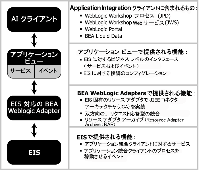 アダプタは、BEA WebLogic Integration の Application Integration の機能と組み合わせて使用します。これらの機能により、系統的な標準ベースのアーキテクチャが提供され、エンタープライズ アプリケーションへのビジネス志向のインタフェースがホストされます。