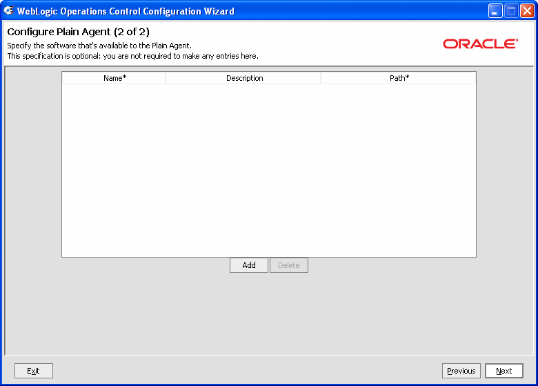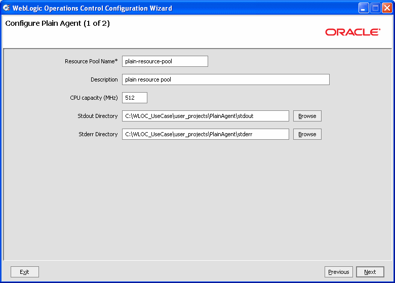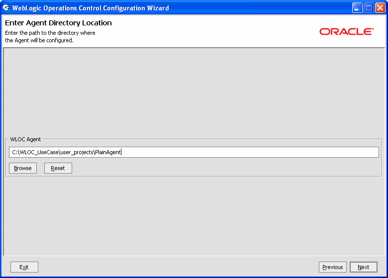 この例では、デフォルトの場所 C:\WLOC_UseCase\user_projects を使用し、ディレクトリ名を PlainAgent に変更します。