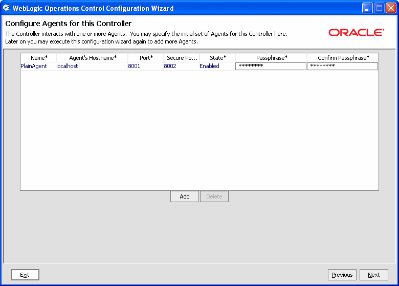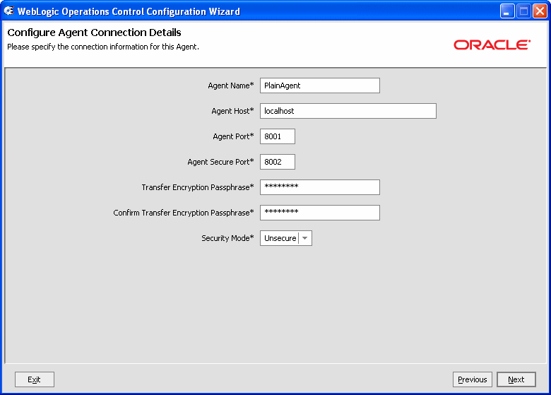 | 注意 : | この例では、エージェントとコントローラ間で SSL を使用する必要がないため、[Security mode] フィールドの [Secure] 設定を選択する必要はありません。ただし、プロダクション環境の場合は、セキュアな設定を使用し、パスワードとパスフレーズを適宜設定する必要があります。セキュアな通信の詳細については、『コンフィグレーション ガイド』の「セキュリティのコンフィグレーション」を参照してください。 |