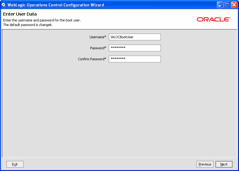 | 注意 : | デフォルトのユーザ名は WLOCBootUser、デフォルトのパスワードは changeit です。 |