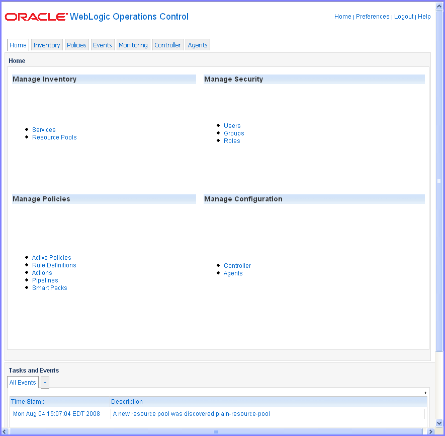 ログインに成功すると、WLOC Administration Console のホーム ページが表示されます。