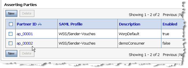 testailias.der) that you generated on the consumer to the producer using any method you want, such as FTP or SMB. You can place the file in any directory on the destination machine. testalias. | Tip: | The WsrpDefault asserting party is set up for the producer’s default WSRP key. If the consumer and producer applications were running on the same server, the WSRP key of the consumer would be accepted by the producer. It is a good practice to delete the WsrpDefault party for an application that is in production. |