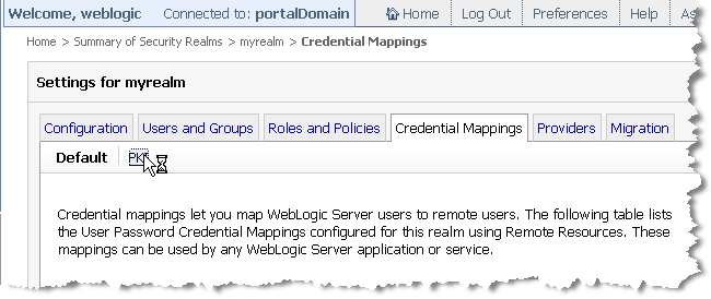 | Tip: | PKI, or public key infrastructure, allows the exchange of data through the use of a public and a private cryptographic key pair that is obtained and shared through a trusted authority. For more information, see “Configure Credential Mapping Providers,” in the WebLogic Server documentation. |