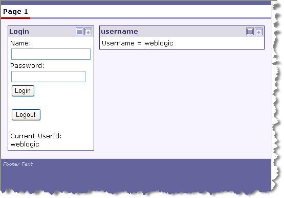 Checkpoint: In the previous steps, you associated this consumer, consumer92, to a key to sign the SAML assertion. If you now try to log in to the remote portlet, the previously seen error does not appear. This means that the consumer is now properly associated with a key. However, now after logging in, the user name is null, as shown in Figure 15-34. This is because this consumer is not yet known to the producer. The next set of steps demonstrate how to configure the WebLogic Portal 8.1x producer to accept the WebLogic Portal 9.2 or later version consumer’s key.