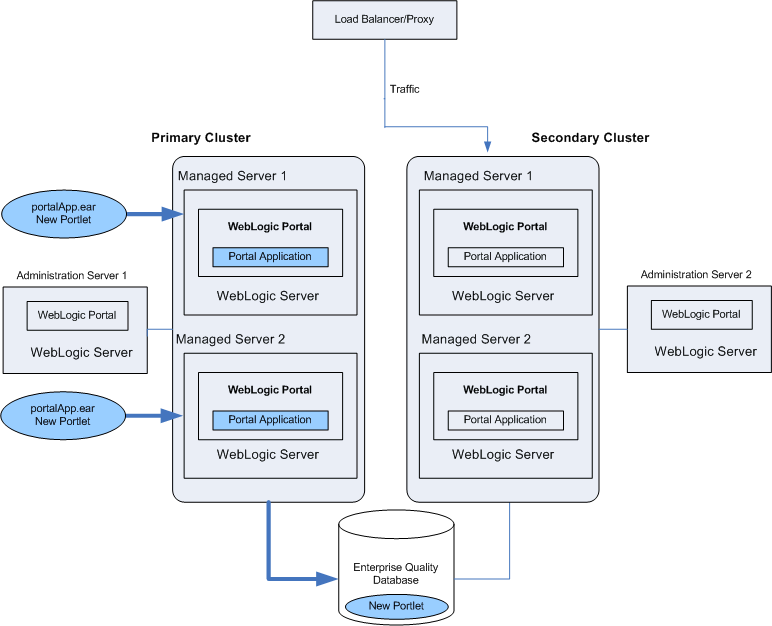 One limitation of redeploying a portal application to a WebLogic Server cluster is that during redeployment, users cannot access the site. For Enterprise environments where it is not possible to schedule down time to update a portal application with new portlets and other components, a multi-cluster configuration lets you keep your portal application up and running during redeployment.
