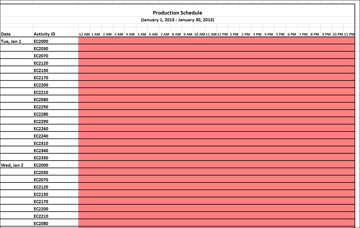 Erstellt eine Excel-Datei, die in einem ähnlichen Format wie ein Gantt-Diagramm Aktivitäten zeigt, die an jedem der Tage im ausgewählten Bereich arbeiten.