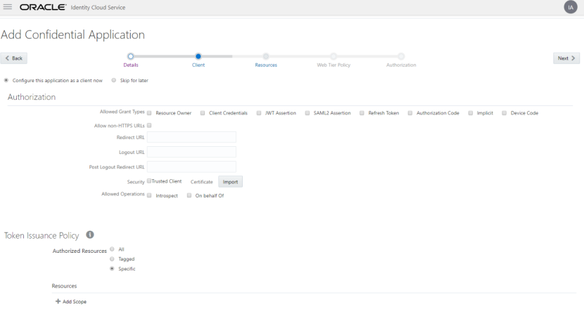 - Click Next option, the Web Tier Policy screen appears, by default the Skip for later option is selected.