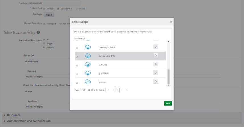 - Go to the Configuration tab, from the Token Issuance policy section, click Add Scope option. The Select Scope dialog box appears and then select the Service Layer DEV application.