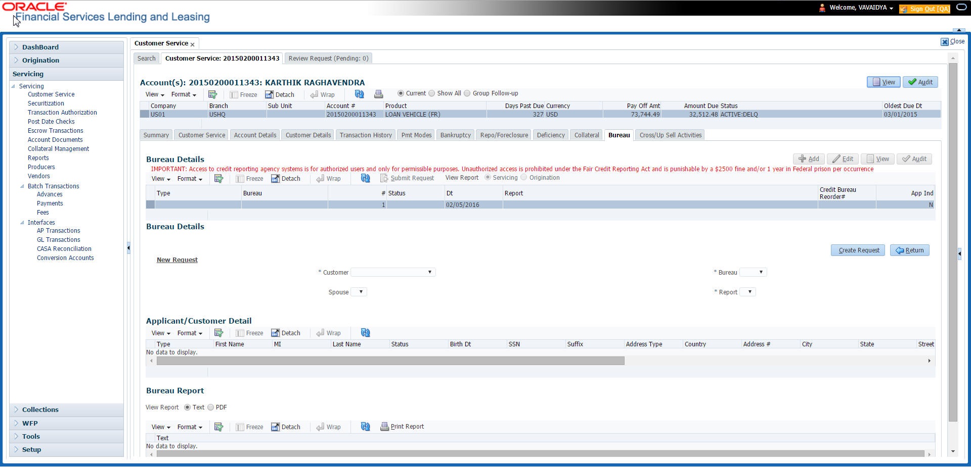 After an application has cycled through the Loan origination process, it becomes an account. Account maintenance and collections tasks can be performed with Oracle Financial Services Lending and Leasing’s Customer Service screen.