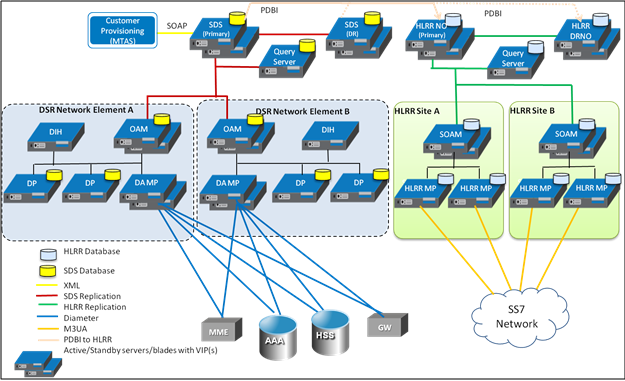 The SDS for HLRR components consists of a SDS Primary Provisioning site, SDS DR Provisioning site, HLRR Primary NO site, and HLRR Disaster Recovery NO site. The SDS sites replicate data to other SDS systems (such as Query server and data processing SOAM). The HLRR sites replicate data to other HLRR systems (such as the Query server and SOAM).