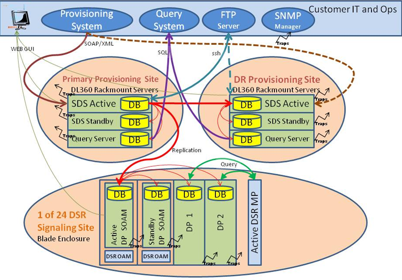 The SDS system consists of a Primary Provisioning Site, a Disaster Recovery (DR) Provisioning Site, and up to 24 Signaling Site servers with redundant data processor Site Operation Administration and Maintenance (SOAM) servers and up to 2 data processing blades. Each provisioning site has an active/standby pair of servers in a High Availability (HA) configuration and a third server configured as a Query server.