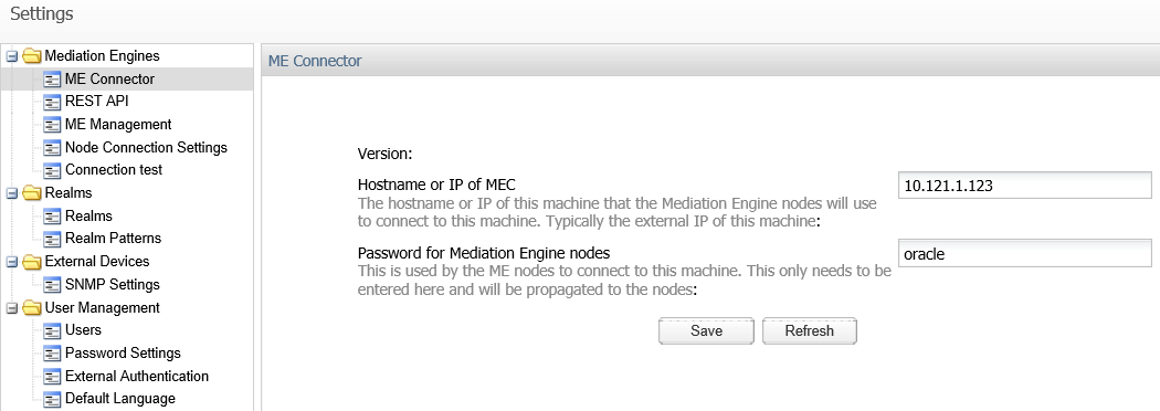 Mediation engines use the password for authenticating probes at Mediation Engine Connector. The default password is oracle and should be changed by the administrator. Its value should be identical with the password set in the mediation engines ( Proxy authentication secret field of the System Settings panel).