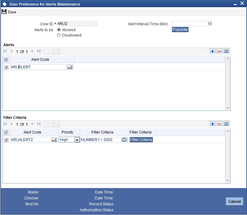 The system display specific alerts to the user if certain conditions are satisfied. You can maintain the conditions and the alerts to be displayed on fulfilling such conditions under ‘Filter Criteria’.