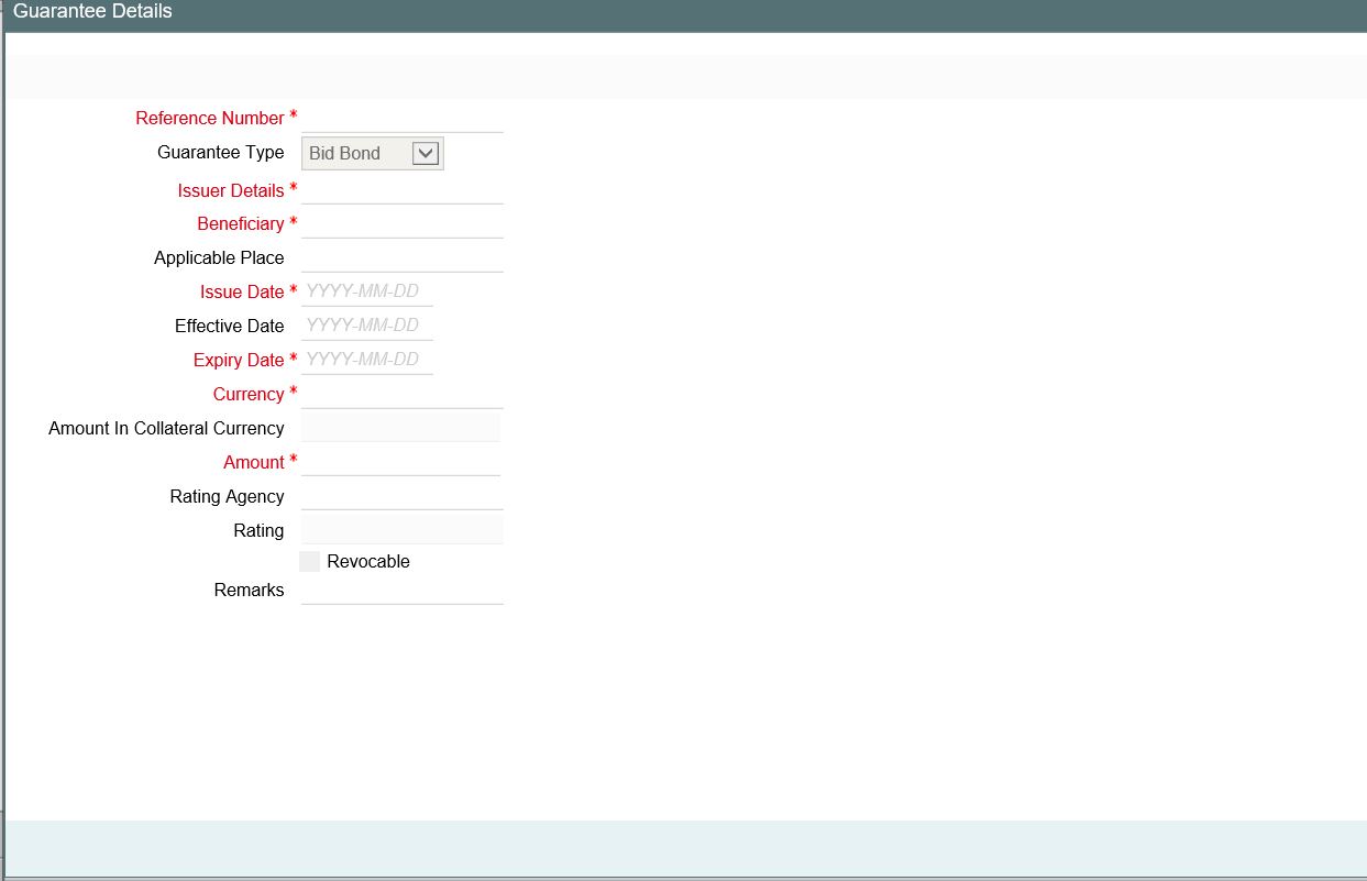 Using this screen, customer collateral of type other bank deposits can be maintained. Multiple other bank deposit records can be linked same customer collateral. Collateral value is updated duly considering total amount of these deposits.