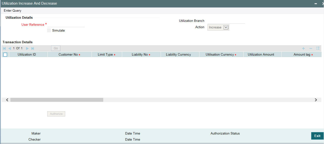 All utilization transactions maybe captured in their own external systems or through the ‘Utilization Transaction’ screen. The utilization details for each transaction taken place in the external product processor have to be sent to Oracle Banking ELCM through Gateway online Inbound or Gateway Batch Inbound process.