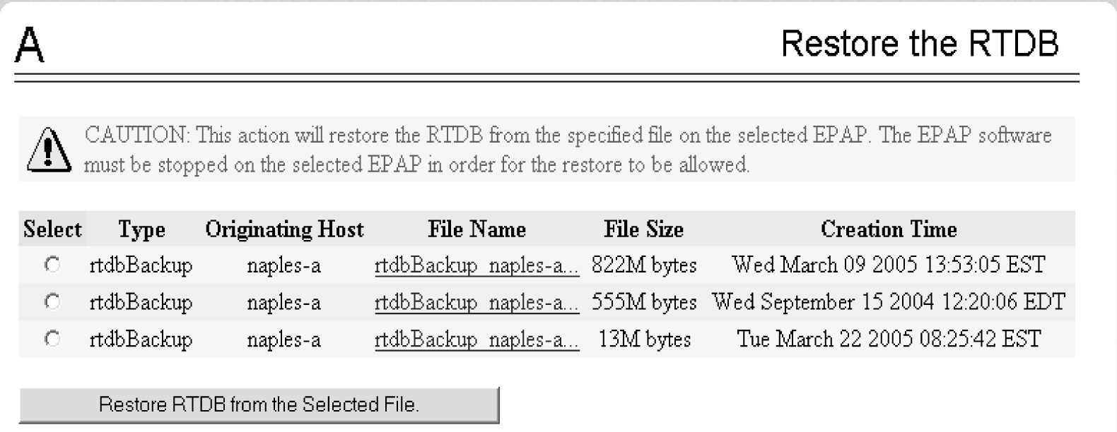 To restore the EPAP’s RTDB from a backup file, contact My Oracle Support (MOS).