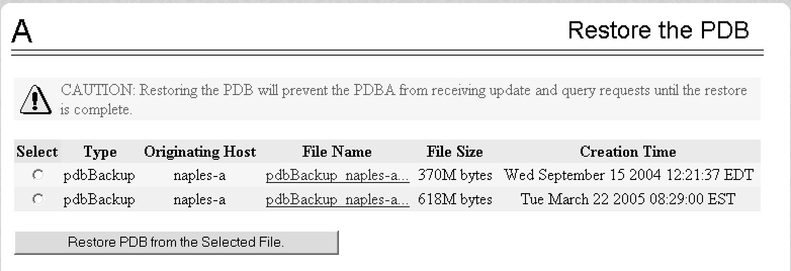 Back up the PDB daily (see Backing Up the PDB).Use the following procedure to restore the PDB from a previously prepared backup file.
