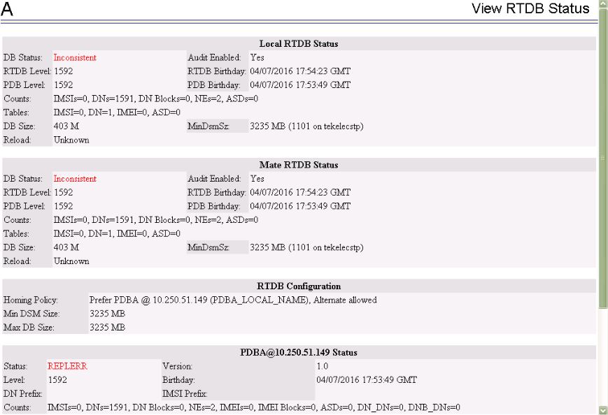 The real-time database for one or more Service Module cards is inconsistent with the current real-time database on the Active EPAP fixed disks