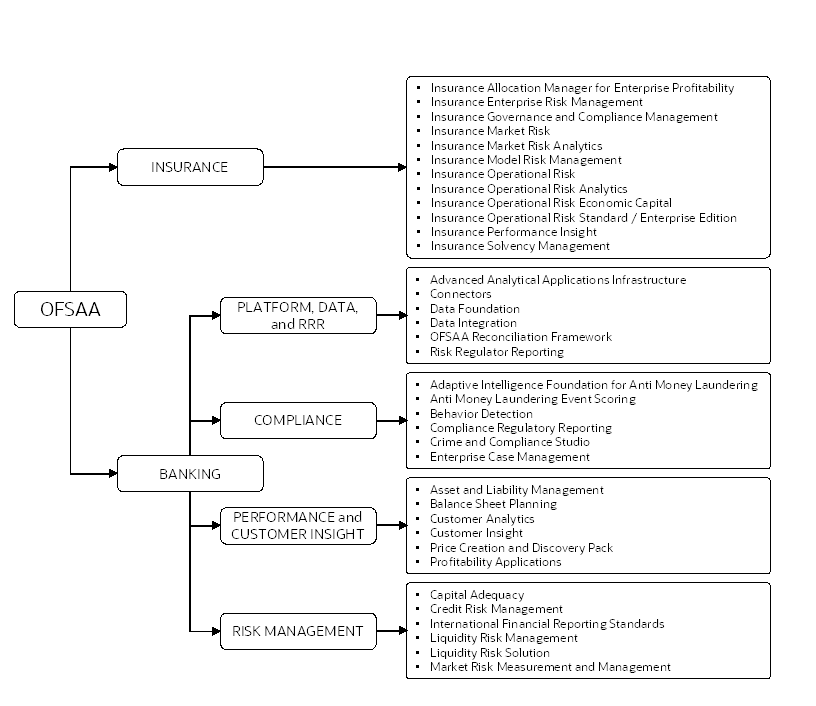 · Oracle Financial Services Analytical Applications Infrastructure (OFS AAI): powers the Oracle Financial Services Analytical Applications family of products to perform the processing, categorizing, selection and manipulation of data and information required to analyze, understand and report on specific performance, risk, compliance and customer insight issues by providing a strong foundation for the entire family of Oracle Financial Services Analytical Applications across the domains of Risk, Performance, Compliance and Customer Insight.