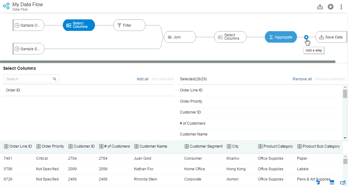 データ・フローを構築するには、ステップを追加します。各ステップでは、データの追加、表の結合、列のマージ、データの変換、データの保存など、特定の機能を実行します。ステップを追加して構成するには、データ・フロー・エディタを使用します。各ステップは、追加または変更時に検証されます。データ・フローを構成したら、それを実行してデータ・セットを作成します。
