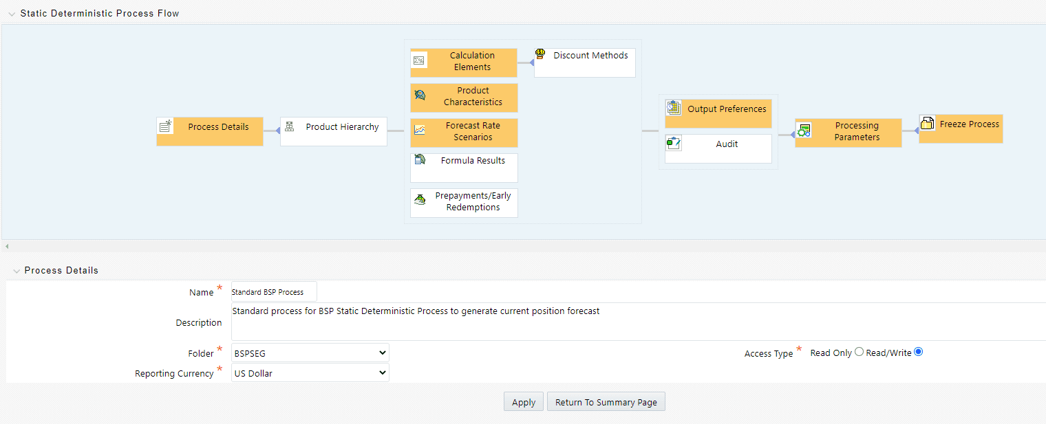 BSP Static Deterministic Processes operate on instrument-level data to generate outputs based on a set of User-defined Forecast Rate Scenarios. BSP Static Deterministic Processes only generate information about current position instrument data; they do not generate any forecast data related to new business. In BSP, new business forecast outputs are generated within Dynamic Deterministic Processes that are executed from BSP's Planning User Interfaces.