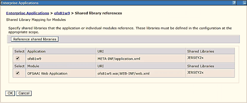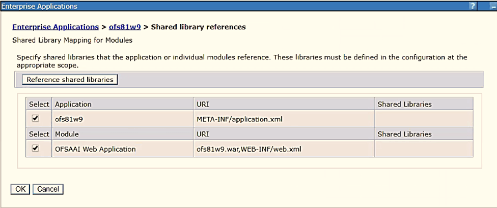 Select the application or module and map the shared libraries. Click OK. In the following figure, ofsa is selected.