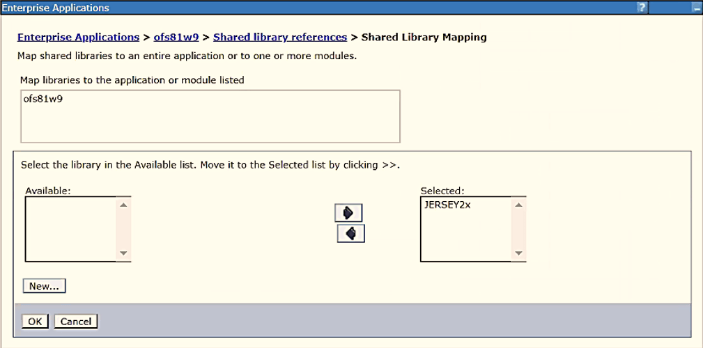From the Shared Library Mapping window, move the required shared libraries from Available to Selected. In the following figure, JERSEY2x is selected.