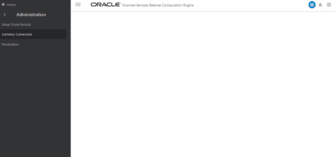1. From OFSBCE Home, select Financial Services Balance Computation Engine. In the Navigation List, select Currency Conversion.The Currency Conversion Settings page is displayed.