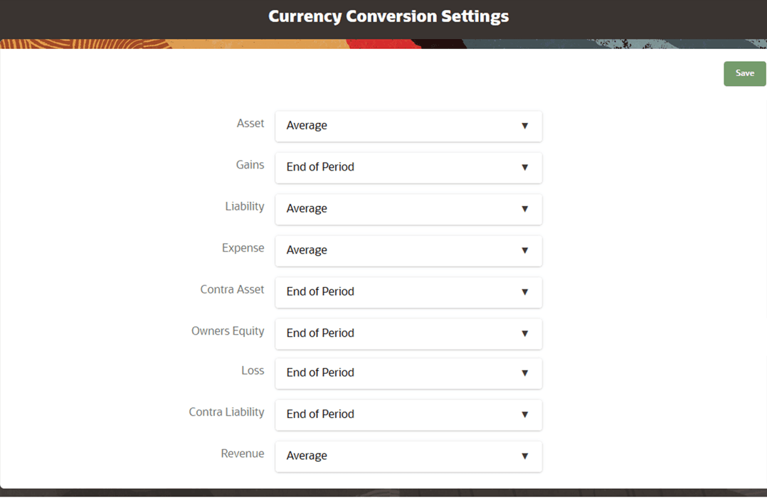Select the End of Period, Daily or Average Rate Type for the following GL type entities: