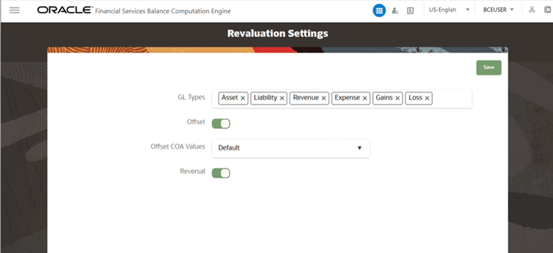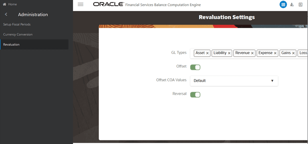 1. From OFSBCE Home, select Financial Services Balance Computation Engine. In the Navigation List, select Revaluation. The Revaluation Settings page is displayed.