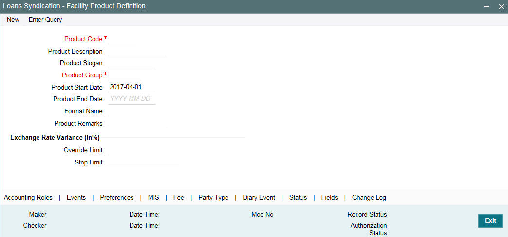 To create a borrower facility product, you can specify the basic details such as the Product Code, Group, Description, and so on in the Loan Syndication – Facility Product Definition screen. You can then use the other product definition screens to set up preferences for the product.