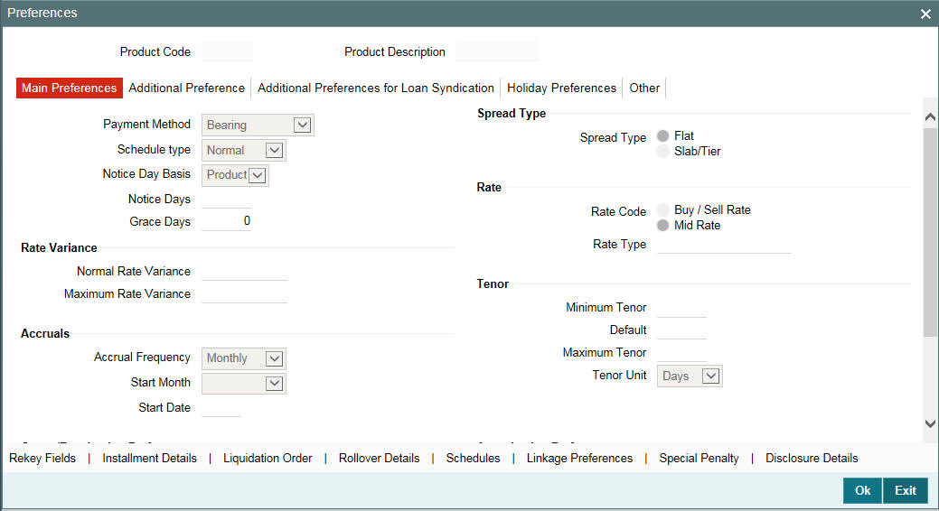 Preferences are those options you can use to specify attributes for a product. These attributes are picked up and applied automatically to any contracts involving the product. For instance, for contracts under a borrower facility syndication product, you can define when intimation must be sent to participants to fulfill their commitments towards a scheduled drawdown.